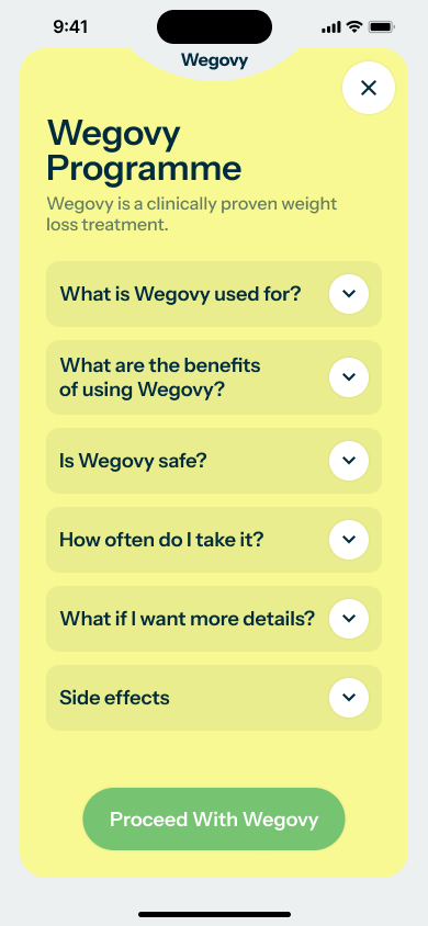 Begin with a quick digital consultation designed by leading weight-loss experts. It lets you know right away if Wegovy is suitable for you. If not, we may recommend a different weight loss programme that better suits your needs.